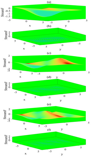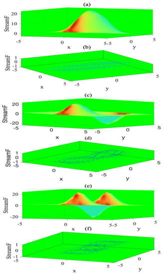 The Soliton-type vortex monopole (a,b, with parameter n = 1), vortex dipole (c,d, with parameter n = 2), and vortex tripole (e,f, with parameter n = 3), expressed by stream function solution (23) with its other parameters chosen as: and .