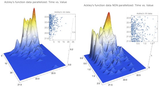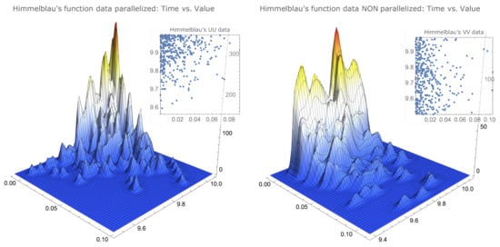 This section is devoted to present a computational study aiming at exhibiting the effects of parallel computing with the pure random search algorithm. Intuitively, asynchronous parallelisation of an algorithm with the parallel runs running independently is tantamount to performing the evaluations of the algorithm in several different machines, not necessarily simultaneously; with this perspective, it seems equivalent to perform four thousand search steps in a single machine or one thousand search steps in each one of four similar distinct machines and then collect the results. It may be observed that, in order to consider the possible performance improvements with the parallelisation of an algorithm, we have to account for the execution times. Moreover, there is evidence of an upper limit for the gain obtained by the parallelisation of an algorithm, namely Amdhal’s Law (see ([], p. 65)) or the latter refined Gustafson’s Law (see []). In Remark 5, we suggested a procedure to take into account the execution time of the best performing copy of the parallelised algorithm in order to stop the algorithm. In the following, we will not stop the algorithm whenever there is a copy of the algorithm satisfying the stopping criteria. Instead, we will stop the parallelised algorithm only when all the copies satisfy the stopping criteria and take the result of the copy—both in the variables time of execution and value attained—having the value attained when stopped that is closest to the maximum. This approach also allows us to study the improvement in the time variable in a simple way.