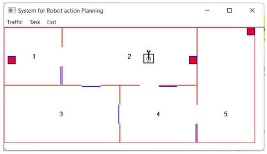 This DMS deals with elements of sets, mentioned in Section 3 and Section 4 of this article. Here, X includes the positions and states of the robot (such as is_at(robot, door45, now); or is_with(robot, box1, now)), S contains states of WS (such as stands(door12, closed, now); or is_in(box1, room1. now)), whereas D consists of a list of actions: “go_to”;“open_door”; “take_box”; “push_box”; etc.