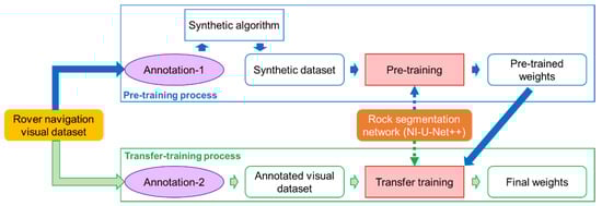 The pipeline of the proposed rock segmentation framework. The rover navigation visual dataset used in this research is the Katwijk beach planetary rover dataset [49], while it can be different in other scenarios. The synthetic dataset for the pre-training is not augmented, while the annotated visual dataset for the transfer training is applied augmentation to extend the dataset.