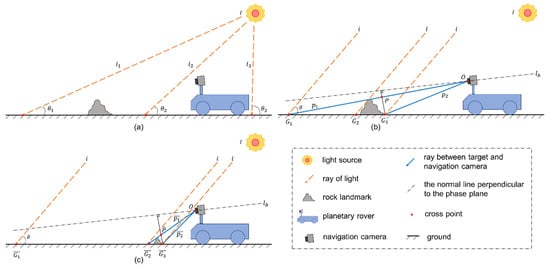 The synthetic algorithm uses image processing technology and the illumination intensity-based assumption. Equations (1)–(9) and Figure 2 depict the illumination intensity-based assumptions and the corresponding process based on the geometrics and mathematics. Figure 2a abstracts a typical navigation scenario of the planetary rovers using a sketch. The light source () can be approximated as the sun in the scenario. The angles between the rays , , and of the light and the horizontal ground () are , , and , respectively. When is significantly far away from the ground , this research considers that all light rays are parallel to each other, so the angles , , and of , , and and the horizontal ground are equal (see Equation (1)).