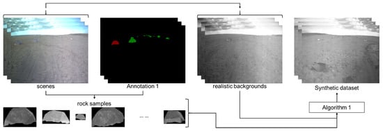 - Then, the synthetic algorithm utilizes these backgrounds and rock samples to generate the synthetic dataset. The synthetic dataset contains 14,000 synthetic images and corresponding annotations.