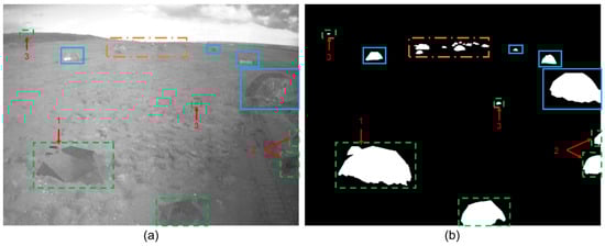 The reasons for adopting the Katwijk dataset are as follows: (i) The focus of this research is to integrate a real-time and E2E rock segmentation framework into the navigation vision of planetary rovers. Thus, a navigation vision stream for evaluating the real-time performance is essential. (ii) The Katwijk dataset involves all relevant landmarks supported in the research of Ono et al. [28]. (iii) Other datasets are not suitable for this research. For example, [54] involves some targets that are less likely to appear in planetary exploration (such as the tree, wall, and people). (iv) Other datasets (such as NASA raw images [55]) contain many different types of rock samples, introducing a more complex marginal probability distribution (this research utilizes the concept about task, domain, and marginal probability distribution from [56] as the fundaments). However, rock diversity (or even new rocks [38]) is not the focus of this research but an entirely new discipline.