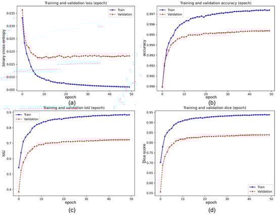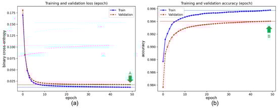 The loss and accuracy curves of Chiodini2020 [44] using the synthetic dataset. (a) Refers to the epoch-wised loss curves in the training and validation sets. (b) Refers to the epoch-wised accuracy curves in the training and validation sets.