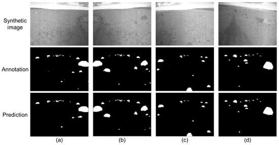 It is noteworthy that the proposed synthetic algorithm is a typical incremental method through embedding new rock samples into the original image, which inevitably adds many large and obvious rocks. Thus, the synthetic algorithm may lead the quantitative metrics to a better result in the pre-training process than the transfer-training process. In addition, the metrics adopted in this research include the accuracy, intersection over union (IoU), and Dice score.