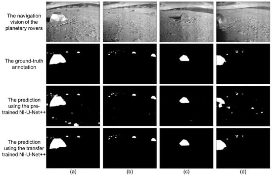 Planetary rovers integrate various sensors and computing units, making the study an interdisciplinary research topic of subjects such as mathematics, human–robot interaction, and computer vision [1,2,3]. The Spirit rover endured the Martian winter, survived 1000 Martian days (sols), and traveled more than 6876 m, while the Opportunity rover traveled more than 9406 m [4]. However, the space environment poses challenges to the planetary rover operation [5]. The Spirit and Opportunity rovers experienced communication and function failures during their explorations [6,7]. To prevent this, automating onboard systems is essential for future planetary rovers [3,8]. This research focuses on the semantic terrain segmentation from the monocular navigation vision of the planetary rovers [8], which can provide support for the high-level planetary rover functionalities.