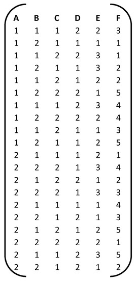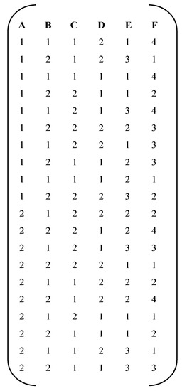 Guo developed a method to construct efficient mixed-level fractional factorial designs, which are also known as EAs (see [2]). These are efficient alternatives to factorial experiments, possessing economical run size and having desirable properties associated with near balance and near orthogonality. In [2], a new optimality criterion called the ‘‘balance coefficient’’ was used to evaluate the balance property of the design matrix and a modified -optimality criterion that can be used to measure the degree of orthogonality of unbalanced design matrices. These criteria were combined into an objective function to be optimized, and a genetic algorithm approach was developed to build the EAs, as in Figure 1, note that this array contains six factors, A-F and 20 runs. In addition, Guo developed the General Balance Metric (GBM), a criterion used to measure the balance property of mixed-level designs [11].