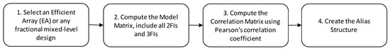 This paper explores the use of Pearson’s correlation coefficient and the correlation matrix to construct alias structures for mixed-level designs. This algorithm can be viewed as an alternative to more complex methods, and the resulting alias structures resemble those commonly used for two-level designs. These structures allow the user to visualize the existing correlations among the different terms in the design, especially the main effects and low order interactions. In addition, this method can be effectively used in choosing subsequent runs in a sequential experimentation approach. The terms most highly correlated in the base design can be the focus for the additional runs to best separate these terms. The fractions considered for computing the alias structures are the EAs developed in [2]. The method consists of four simple steps, as displayed in Figure 3.