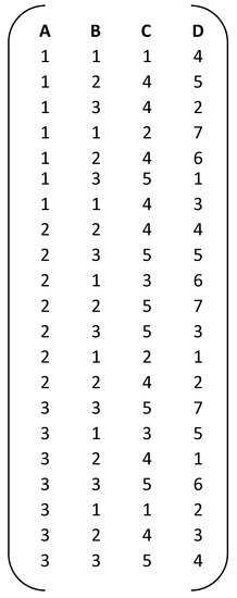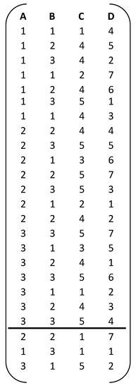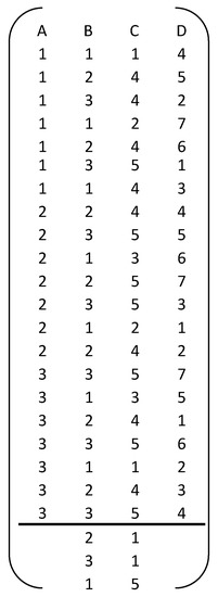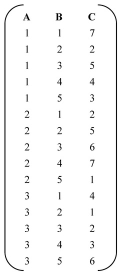 The first step consists of selecting a fractional mixed-level design. This fraction can be constructed by any method, but we will make use of the EAs developed in [2]. Consider, for example, the EA (15, 31 51 71) described in Figure 4, containing 15 runs and 3 factors with 3, 5, and 7 levels, respectively.