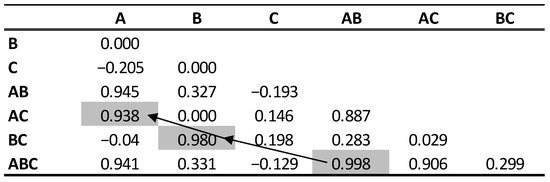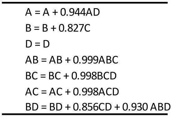 After this step, AB and ABC are removed from consideration and the next highest correlation corresponds to B and BC with 0.980. The alias structure is augmented with a new chain, resulting in