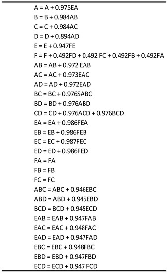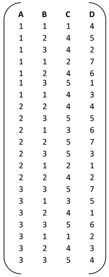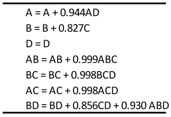 Once the model matrix is generated, the next step is to compute all the existing correlations in the design: among the main effects, between main effects and interactions, and among interactions. The Pearson’s correlation coefficient (Equation (1)) was used to compute these correlations. The correlation matrix for the EA (15, 31 51 71) is shown in Table 2.