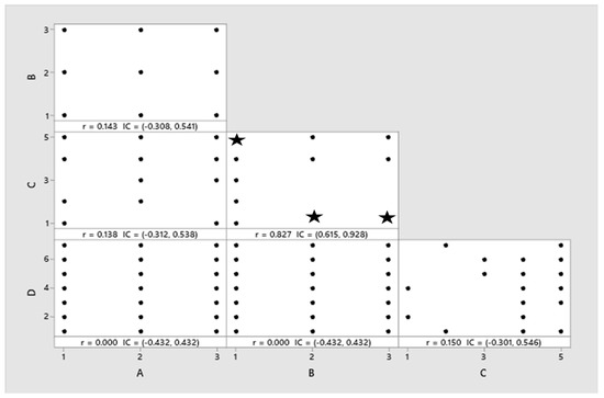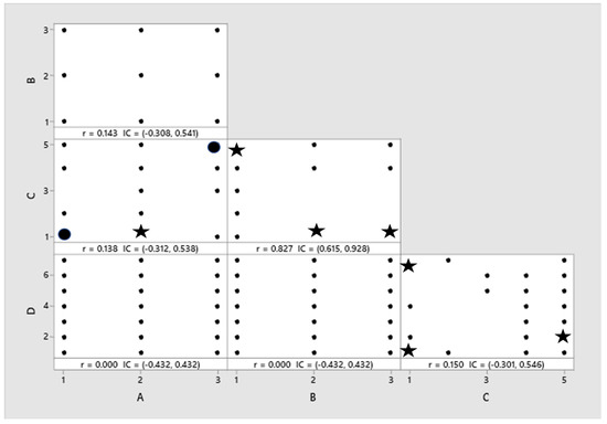 Note that the alias structure indicates that factors B and C are strongly correlated. The correlation plot (Figure 10) shows that one way of breaking this correlation is by adding additional runs (2,1), (3,1) and (1,5) for B and C respectively. These runs are indicated by stars. The resulting yet incomplete design is shown in Figure 11.
