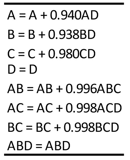 To determine the aliases in nonregular designs, we use the regression method [1,19,20]. As a result, we obtain an alias matrix that shows the alias pattern and the partially aliased effects. This method can also be used for regular designs. In [21], a method to estimate the confounding coefficients for two-level split plot designs was developed.
