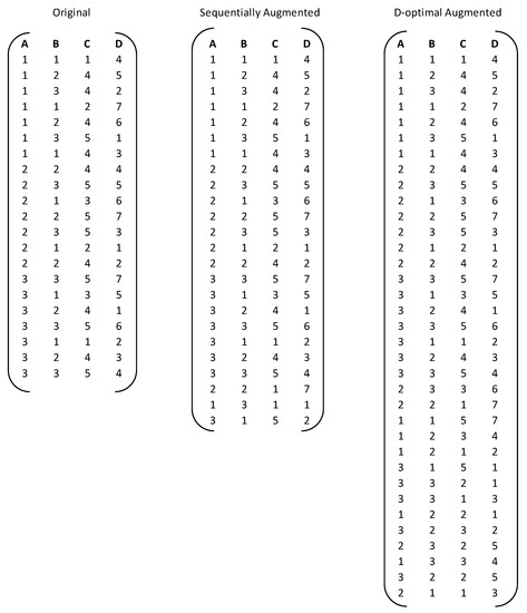 To construct mixed-level fractions, we recommended the approach proposed by [34,35] to produce a near orthogonal balanced design. To achieve more orthogonality, we recommended the use of the sequential experimentation algorithm, presented in Section 5, or D-optimal augmentation. The sequential experimentation algorithm is useful in cases where only a few terms needed to be decoupled. It can be used to generate significant savings in runs, given that the D-optimal augmentation technique is usually more expensive. We do not recommend the use of foldovers or semifolds, given that these techniques require computer programming and complex search methods, such as genetic algorithms and exhaustive searches, and they may not be the best option for most practitioners.