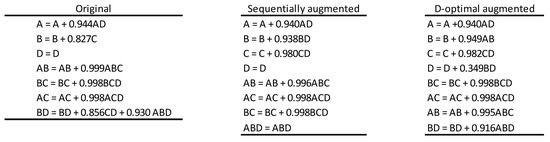 The experimenter is interested in augmenting the design to break the correlation between factors B and C, and two options are available: the sequential augmentation algorithm, presented in Section 6, and the D-optimal augmentation. Figure 17 shows the original, sequentially augmented, and D-optimal augmented designs, and Figure 18 shows the corresponding alias structures, Moreover, it shows that the sequentially augmented and D-optimal augmented designs can estimate all main effects, apart from each other, because they belong to different alias chains. These designs have no problem estimating the correct model and optimizing the process. On the other hand, the original design was not able to estimate factor C, which means that the correct model will not be estimated, and the optimization process will not be as good as that of the other two designs. To prove this, a Monte Carlo simulation was performed. Figure 19 shows the simulated data for the three designs generated in such a way that effects of A, B, and C, and the interaction AB, should be reported as significant. A low noise level was employed.