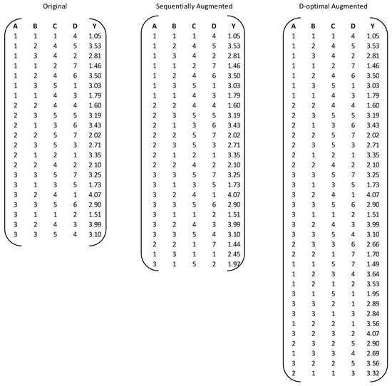 Simulated data for original, sequentially augmented, and D-optimal augmented designs.