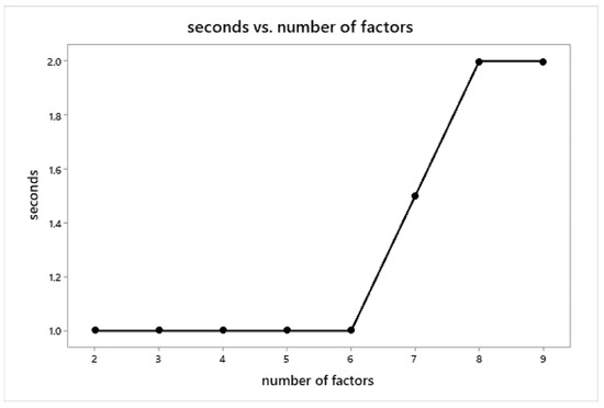 The MATLAB program significantly reduced the time invested in the construction of alias structures for mixed-level fractional factorial designs. Figure 20 shows the computational time required by the program, which ran on a computer with an AMD E-450 processor and a RAM of 2 GB. Building structures for a 9-factor mixed-level fractional design using the program took only 2 s. The program also reduced the uncertainty of calculations and interpretive errors that commonly appear when alias structures are built manually.