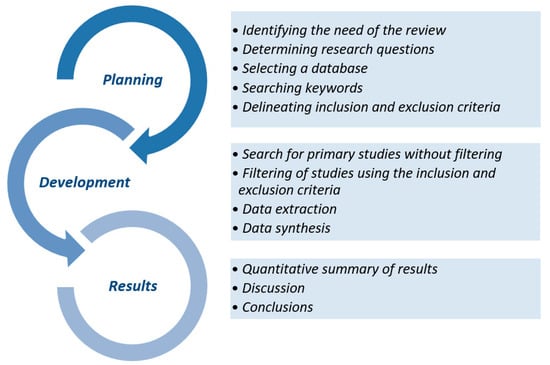 This work was conducted according to the guidelines proposed by Kitchenham [35] for literary SR and adapted to our research framework. This model was initially used for reviews in the fields of medicine and computer science. In this case, the review focused on the analysis of scientific articles, and following the steps of SR of the literature; three fundamental phases were articulated: planning, development and results of the review (Figure 1).