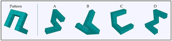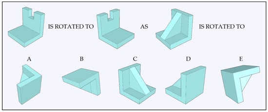 Specifically, the MRT test, which was developed by Vandenberg and Kuse [56], is one of the tests with the highest level of acceptance and applicability worldwide [57]. The MRT test is designed to measure the ability of mental rotation, through a test consisting of 20 items, and in each of them, the user must choose the correct figure from four options (A–D) that represents the rotation of the pattern figure (Figure 3).