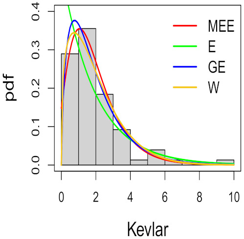 In this application we compared the performances of the MEE, Weibull, generalized exponential and exponential distributions.