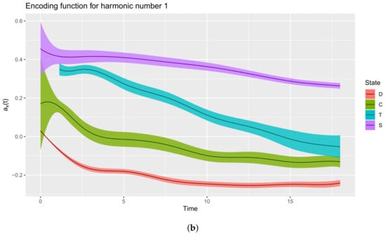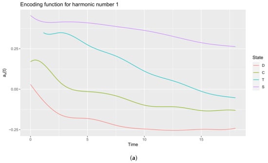 To the best of our knowledge, and quite surprisingly, there is no recent research devoted to categorical functional data despite its ability to model real situations in different fields of applications: health and medicine (status of a patient over time) [], economy (status of the market) [,], sociology (evolution of social status) [,], and so on. As a starting point on this topic, we mention the works of [,,,]. These works are devoted to the extension of factorial techniques (canonical and multiple correspondence analysis) towards functional data. The authors call that methodology “harmonic analysis”. Applications of these techniques are presented in [] for analysing career data and in [] for studying the spectral properties of the transition probability matrix of a stationary Markovian jump process with continuous time. In [], the authors cluster paths of semi-Markov processes using mixtures with application to sensory data. In [], the authors present the harmonic analysis applied to the Brownian motion as an extension to an infinite (continuous) number of states.