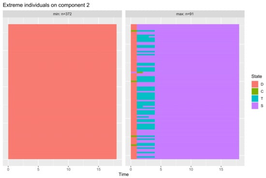 Introduced in [,] under the name “analyse harmonique qualitative”, multiple correspondence analysis is extended to categorical functional data. There are several ways to complete this; we have chosen in this work to introduce it as a problem of finding the latent variables (principal components) that are the most related to the process . Therefore, the principal components will enable defining the optimal encoding of states .