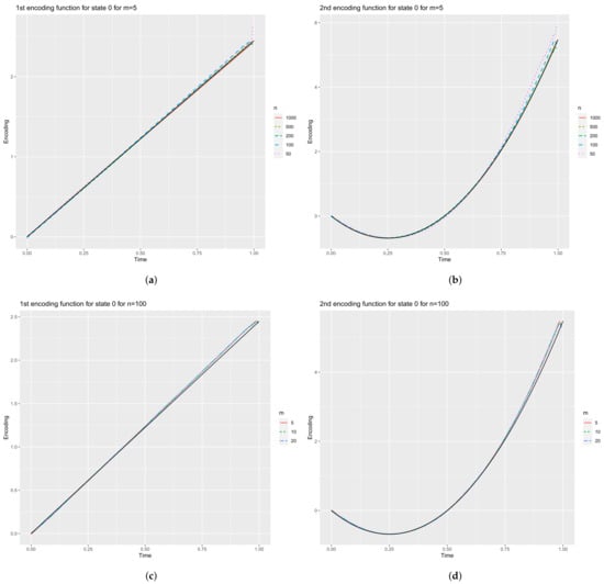 True (solid black) and estimated encoding functions for state 0 of the birth-and-death process. The estimated encoding functions are the mean of 100 samples. (a) First encoding function for state 0 (); (b) Second encoding function for state 0 (); (c) First encoding function for state 0 (); (d) Second encoding function for state 0 ().