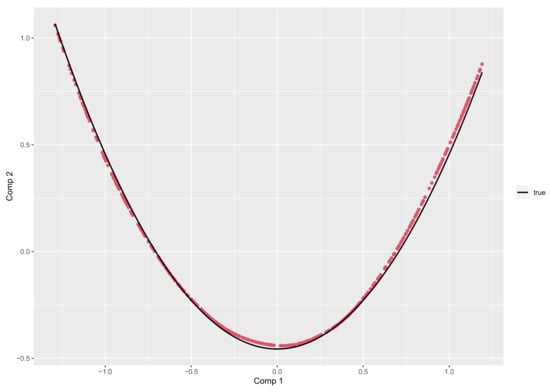 In Figure 14, we check the relation between the first and second principal component (33). The theoretical equation is displayed in black, whereas the computed principal components for a sample with and are in red. We note the closeness of the computed components with the theoretical equation.