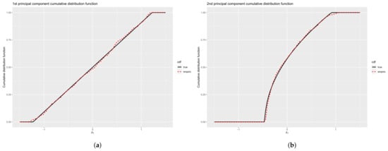 In Figure 15, the cumulative distribution functions (cdf) for the two first principal components are displayed as well as their empiric equivalent for and . As described above, follows a uniform distribution between and , the empirical cdf (in red) is close to the theoretical one. The same representation is made for .