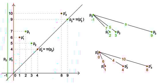 Figure 5 shows the two weighted graphs which realize the natural pseudodistance equal to the bottleneck distance between the persistence diagrams of Figure 2, when the persistence function is . See the proof of Proposition 5 and the construction of Definition 11 for the underlying ideas.