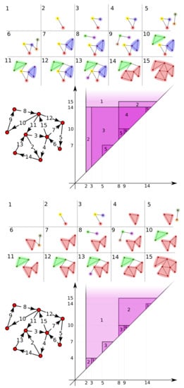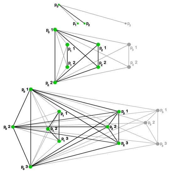Let n be a positive integer. Given a weakly directed poset Q, we can consider the graph whose vertices are , where distinct vertices and are connected by an edge if v and w are comparable in Q (see Figure 3 for an example of the constructions relative to the filtration H of Figure 2 and ). This mapping induces a functor .
