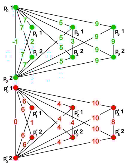 The weighted graphs whose natural pseudodistance equals the bottleneck distance of the persistence diagrams of Figure 2, relative to the persistence function . Above (resp. below), the weighted graph corresponding to the green (resp. red) persistence diagram and to the upper (resp. lower) Hasse diagram of Figure 2.