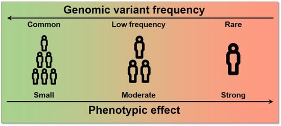 Each of these genetic variants, which likely arose from single different individuals, are spread and fixed within the population over long periods of time and follow evolutionary rules based on the harm or benefit that each variation provides to the individual. As a consequence of this process, variants have different frequencies within each population, as they are carried by different proportions of individuals. Variants with frequencies are defined as common, while variants with frequencies or are defined as low-frequency and rare, respectively. SNVs with a frequency of >1% in the population are typically called Single Nucleotide Polymorphisms (SNPs). Since complex diseases are common, originally, only common variants were considered to be implicated (common disease-common variant hypothesis); the possibility of extending GWAS even to low-frequency and rare variants has shown, however, that variants across the entire frequency spectrum are likely to be involved []. The effect size, which is the contribution of these variants to the phenotype, is generally measured by an odds ratio (the odds of having the disease with the variant divided by the odds of having the disease without it) for a binary trait. Typically, an inverse relationship exists between the frequency of a variant and its effect on diseases: high-impact variants are normally found at lower frequencies because of a stronger negative selection pressure (Figure 1) [].