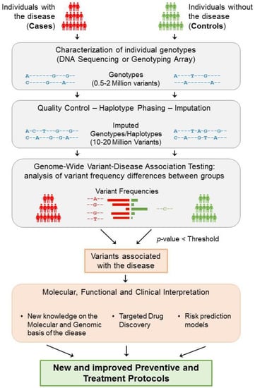General strategy underlying GWAS. The study of a complex disease through GWAS starts with the selection of a large group of individuals that can be segregated into cases (affected) and controls (non-affected). Then, each individual genotype is characterized using DNA sequencing techniques or genotyping arrays, obtaining the genotyping information of 0.5–2 million variants from each individual. After ensuring the quality of these data, phasing and imputation techniques are usually applied to increase the number of variants that can be tested to 10–20 million. Each resulting genomic variant is then independently tested to find significant differences in the genotype frequencies between the two groups. Consequently, if a variant is significantly predominant in a group based on an adjusted p-value threshold, then the variant is said to be associated with the disease. Disease-associated variants can then be further analysed to gain insight into their molecular, functional, and clinical implications. As a result of this process, the knowledge obtained from GWAS can help generate and improve the protocols for the better detection, prevention, and treatment of complex diseases.