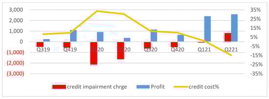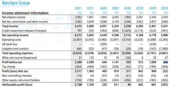 The income information statement from the Barclays Group 2nd Quarter Financial Report provides an example of this (Figure 1). It stated that a total of £1097 million in profit in Q419 decreased to £359 million in Q220. Conversely, the credit impairment charge increased more than fourfold, from £523 million, in Q419, to £2115 million, in Q120. In Q220, it remained substantially higher than that at Q419, at £1623 million. After Q220, the amount accrued decreased back to £608 million in Q320 and £492 million in Q420. Moreover, due to the economic recovery from the COVID-19 pandemic, £797 million of credit impairment was released in Q221 and the single-quarter profit thus increased to £2580 million. The point-in-time characteristics of forward-looking ECL estimation resulted in great volatility in the bank’s profit data.