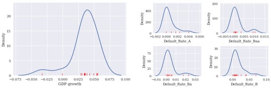 The descriptive statistics and kernel density estimates of DRs and GDP growth are illustrated in Table 1 and Figure 3. GDP growth, in Table 1 and the left panel of Figure 3, indicates left-skewed distributions with significant negative skew-test statistics and p values of 0.001. Conversely, the DRs of all ratings in the right panel of Figure 3 are all positive, right-skew-distributed with p values close to zero. This phenomenon aligns with the reverse relationship between macroeconomic factors (such as GDP) and DRs.