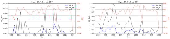 Time series of GDP (see right y-axis) and DRs (see left y-axis) for ratings A and Baa (left panel) and for ratings Ba and B (right panel).