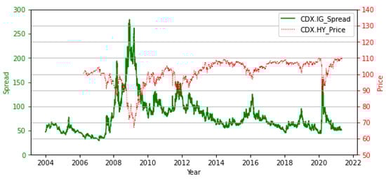 As illustrated in Figure 4, GDP (red line) was slightly negatively correlated with DR. Two of the most liquid CDX indices were the CDX.NA.IG and CDX.NA.HY. The daily data of the CDX.NA.IG (since 2004) and CDX.NA.HY (since 2006) are displayed in Figure 5, and the trends for the two indexes run in opposite directions. This was because high-yield CDS indices (dotted red line) are conventionally quoted in prices, whereas investment-grade equivalents are quoted in spread basis points.