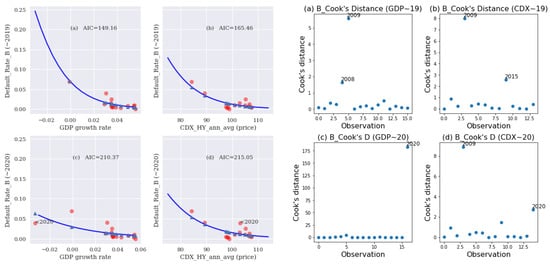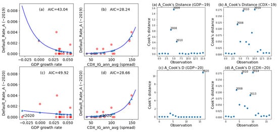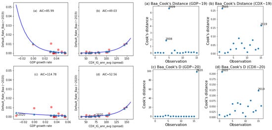 Figure 6, Figure 7, Figure 8 and Figure 9 present the fitted curves (left panels) and Cook’s distances (right panels) of the binomial logistic regression for ratings A, Baa, Ba, and B, respectively. For both the left and right panels in Figure 6, Figure 7, Figure 8 and Figure 9, the left subplots (a) and (c) illustrate the PD model with the GDP covariate (the test model), whereas the right subplots (b) and (d) illustrate the PD model with the CDX covariate (alternative model). To explore the robustness of PD estimation following the COVID-19 pandemic in 2020, we fitted the PD model and calculated the AIC (displayed in the left panel as a legend) and influence measures (displayed in the right panel) for the regression of DR on GDP and on CDX with two data sets, both excluding the 2020 data point (subplots (a) and (b)) and including the 2020 data point (subplots (c) and (d)). We fitted the DRs of the investment rating classes [A, Baa] on the CDX.NA.IG index and fit the DRs of the noninvestment ratings [Ba, B] on the CDX.NA.HY index. For demonstrative purposes and due to data limitations, we used the CDX annual average to fit Moody’s annual DRs.