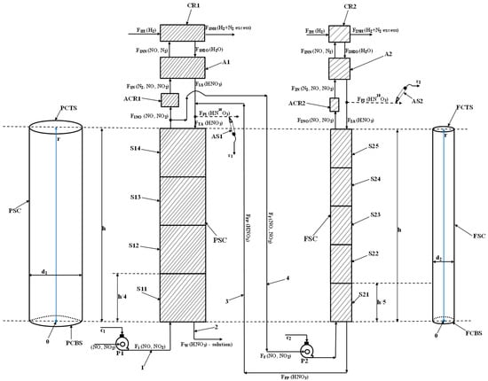 The 18O isotope separation cascade, which is used to obtain the experimental data, is presented in Figure 1 []. By using this separation cascade, the 18O isotope separation is made through isotopic exchange in the system NO, NO2-H2O, HNO3. The separation cascade is composed of two separation columns: PSC—Primary Separation Column and FSC—Final Separation Column. The dimensions of the columns are their height (h = 10 m), the PSC diameter d1 = 5 cm and the FSC diameter d2 = 1.4 cm). Moreover, Figure 1 highlights the sections of the two columns, which are equal. In order to model the 18O isotope concentration variation in relation to the two columns height, the pumps P1 and P2 are used for the supply of the two columns with nitric oxides (NO, NO2) (the FSC is supplied at its base with the nitric oxides, having an enriched 18O isotope concentration, obtained at the top of the PSC). Furthermore, the waste (the nitric acid solution (HNO3)), is evacuated from the PSC base using the pipe 2. The phenomenon of 18O isotope enrichment occurs due to circulation in countercurrent of the nitric oxides and of the nitric acid inside of the two columns. The product can be extracted from the top of FSC (using the pipe figured with dashed line) under the form of nitric acid having an increased concentration of the 18O isotope. Using the r independent variable associated with the 0r axes, the 18O isotope concentration in relation to the two separation columns heights can be highlighted.