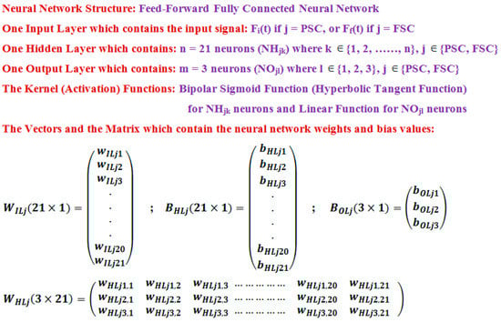In Figure 2, “j” is referring to PSC or FSC. For j = PSC, only the signals above the arrows are considered and for j = FSC, only the signals below the arrows are considered. In both cases, NNj is as a feed-forward fully connected neural network [,,], containing in the structure: