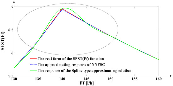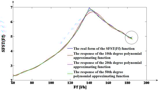 All the MSE values from Table 5 are computed on 1251 pairs of samples of SFST(Ff) function response and of each polynomial response. In the last column of Table 5, the MSE value associated to a 100th degree polynomial approximating function (for the SFST(Ff) function) is presented. From Table 5, the result is that increasing the degree of the polynomial approximating function until the value of 50, the approximation accuracy increases, but after this value, the approximation accuracy starts to decrease. The explanation of this phenomenon is given by the following: the oscillations occurrence in the domain of Ff signal high values, for the polynomials with higher degrees; the oscillations’ amplitude increases at the polynomial degree increase. In this context, it can be remarked that the MSE value is higher in the case of using the 100th degree polynomial than in the case of the 50th degree polynomial. Consequently, the final solution for the SFST(Ff) function approximation using polynomial functions is obtained using a 50th degree polynomial.