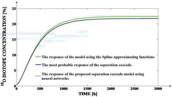In [,,], mathematical models are proposed for separation processes, but having constant parameters. In this case, the usage of AI is not necessarily due to the absence of the necessity to learn variable parameters. In [,], the authors propose distributed parameter processes for separation processes, based on the Cohen equation []. The usage of these type of models has the disadvantage that they cannot be used for highlighting the effects of the parametric disturbances that occur in the separation plant operation. In [,,,], the proposed models are designed for a simplified process, near a steady-state working point. These types of models are not complex enough (they do not cover the entire range of the variation domains of the input and output signals that occur in the separation plant operation) for obtaining high-control performances in the case when they are included in automatic control systems. In references [,], a modelling-simulation method for distributed parameter processes is presented (the Matrix of Partial Derivatives of the State Vector method, associated with Taylor series), considering as case study separation processes. This method generates high accuracy but implies consistent processing resources. This aspect represents a significant problem in including this type of model in automatic control structures. In references [,], neural networks are used to learn some of the structure parameters of separation processes, but only linear parameters. By comparison, the usage of neural networks in the case of the mathematical model proposed in the paper is more justified since they are used to learn nonlinear functions. In [], some examples of using neural networks for the direct learning of the separation processes behavior are given. In the case of the approached 18O separation process, due to its complexity, the learning of its behavior using only one neural network, even a high complexity one, is almost impossible (it is possible only by interconnecting more neural networks). Moreover, in [], the premises of using “hybrid semi-parametric modeling” are introduced. Practically, the proposed model is a hybrid one due to the combining of the analytical modelling with the experimental identification of some of the structure parameters of the separation process and with AI methods.