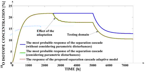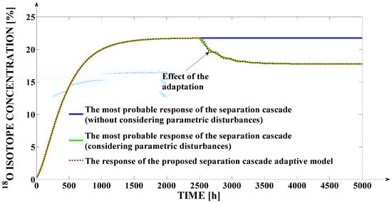 One of the main aims of the article is to propose a highly accurate mathematical model for the separation cascade, a model that will be used further in different applications, as: a reference model in structures for automatic control of 18O isotope concentration; a reference model in determining the influence of the parametric disturbance that occurs in the cascade operation; a reference model in the energy consumption optimization strategy, etc. Another important aim of the present research is to propose a mathematical model that describes the complete dynamics of the separation cascade. Consequently, the two separation columns from the cascade structure are modelled as distributed parameter processes, their dynamics depending both on time and on the position in relation to their heights. Moreover, in order to have the possibility to simulate and to use properly the proposed model in future applications, the modelling has to be applied considering the entire domains of variation of the signals that occur in the separation plant operation (the modelling of the considered separation process near a steady-state working point is not enough due to the fact that a simplified model will imply the consistent decrease in the performances of the 18O isotope’s automatic control system in which it is used as a reference model; in some cases, a simplified model cannot be used for designing a control system). In this context, all the structure parameters of the proposed model are non-stationary ones; more exactly, they present consistent variations in relation to the separation cascade operation regime and intensity. Hence, the separation cascade time constants, “length” constants, separations, and other structure parameters are variable and depend on the columns feeding intensity. This aspect implies a strong non-linear behavior of the separation cascade.