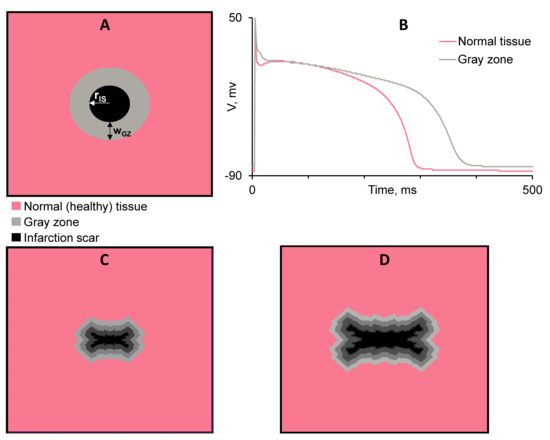 (A) Schematic representation of the geometry of cardiac tissue with the post-infarction scar. Normal tissue (pink), post-infarction scar (black) and gray zone around it (gray). (B) the shape of the action potential vs. time in cells of healthy myocardium (pink) and gray zone (gray). (C,D) Models of cardiac tissue with the post-infarction scar with a realistic shape. The gray zones of different sizes (shades of gray) are shown.