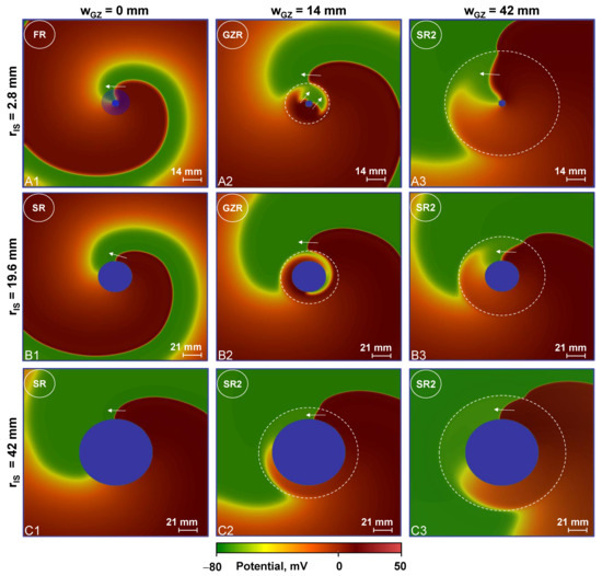 Examples of waves rotating around post-infarction scars of different sizes (top to bottom: = 2.8 mm; 19.6 mm; 42 mm) with a gray zone of different sizes (left to right: = 0 mm; 14 mm; 42 mm). Four rotation regimes are shown: scar rotation (SR), functional rotation (FR, blue shading shows the effective obstacle around which the wave rotates), gray zone rotation (GZR) and scar rotation 2 (SR2). See the text for the description of the rotation regimes. Left column: typical view of the wave rotating around the scar in the absence of the gray zone ( mm). Waves rotate in two regimes: FR (A1) and SR (B1, C1). Middle column: waves rotate around the gray zone in a GZR (A2, B2) and SR2 (C2). Right column: ( mm) SR2 regime in all cases (A3–C3). Arrows show the direction of the wave rotation. Dashed arrows in A2 ( = 19.6 mm, = 14 mm) show wave direction inside the gray zone. Dashed circles show the border of the gray zones. Movies of rotation of spiral waves in GZR and SR2 regimes can be found in the Supplementary Materials (movies S2 and S3).