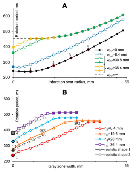 Dependence of the wave rotation period on the radius of the scar () and the width of the gray zone (). (A) Dependence of the wave rotation period on the radius of the scar with the gray zone of a different width. The black line shows cases in absence of the gray zone. The gray dashed line represents periods of waves rotating around a scar in tissue with properties of the gray zone (). (B) Dependence of the wave rotation period on the width of the gray zone in experiments with different radius of infarction scars. Red line shows a case with smaller radius of infarction scar ( mm), purple line—case with bigger infarction scar ( mm). Gray dashed lines show cases of infarction scars with a realistic shape. Scar perimeter is 116.1 mm for a scar with a realistic shape 1 (Figure 1C corresponds to the radius of ideal circular scar of mm), and 233.5 mm for scar with a realistic shape 2 (Figure 1D corresponds to the radius of an ideal circular scar of mm). Filled symbols (•) represent cases of the scar rotation regime. Open symbols (∘) represent cases of the gray zone rotation regime. Marked dots (1)–(4) represent the same cases.
