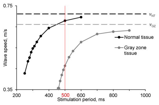 Dependence of the wave speed on the activation period of the wave (restitution curve). Wave speed in normal tissue (black) and tissue with properties of the gray zone (gray) are shown. Black and gray dashed lines show the maximum speed of waves in normal tissue ( m/s) and in the gray zone tissue ( m/s), respectively.