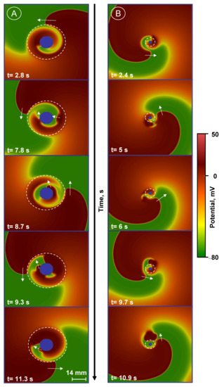 - Xie, F.; Qu, Z.; Garfinkel, A. Dynamics of reentry around a circular obstacle in cardiac tissue. Phys. Rev. E 1998, 58, 6355. [Google Scholar] [CrossRef]