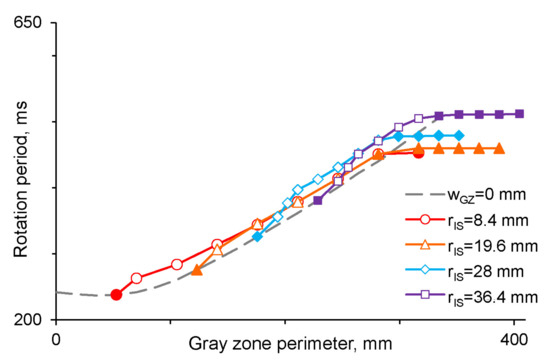 For the gray zone with a large width of mm (see green line in Figure 3A) and large scars , the curve coincides with the dashed line corresponding to the scar rotation 2 regime. However, for mm, we have the gray zone rotation regime as the rotation around the gray zone, which is faster than scar rotation 2. For the gray zone with the largest width of (yellow line in Figure 3A), we have scar rotation 2, except smaller scars of mm. Here, we have again the gray zone rotation. Compared to the green curve, the scar rotation 2 here occurs at the smaller scar radius. This is also logical, as for larger , the corresponding curve is closer to its asymptotic dashed curve.